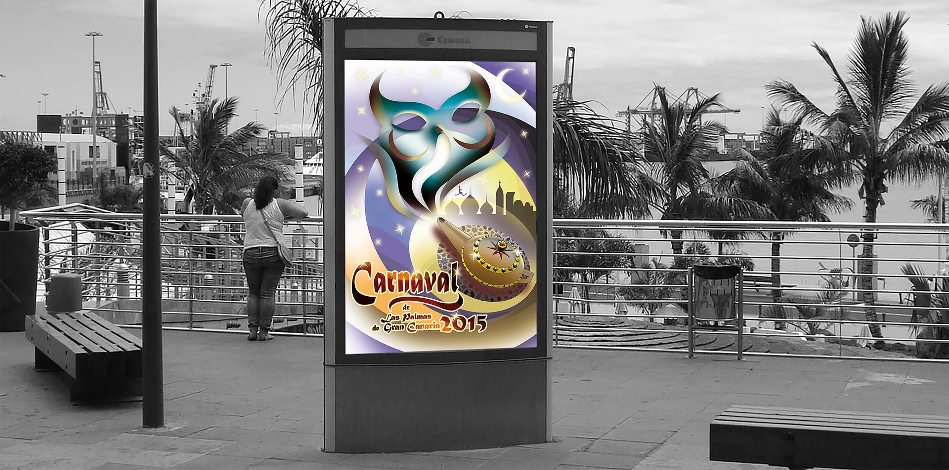 In 2015, I decided to take part once again in the Poster Design Competition for the Carnival of the city of Las Palmas de Gran Canaria. The main theme of that year’s carnival festivities was “One Thousand and One Nights”, evoking the magical tales of Aladdin and the marvellous lamp of the Genie of the Three Wishes. The latter served as the main source of inspiration for the composition of my promotional poster.